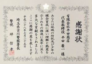 本日、弊社社長が7月25日付けで、埼玉県吉川警察署長様より署長室にて感謝状を頂きました。 これは先代の社長より継続している「地域防犯や子供たちの育成」に約20年間続けてきた弊社の活動に 対し贈って頂いた書状です。当然ながら、私の力は微々たるもので、むしろ歴代から現在に至るまでの 社員さんが少しずつ積み上げてきた努力の結晶であります。 この御恩に報いる様、これからも精進に精進を重ね、引き続き安心安全の業務と、地域防犯や子供たち の育成に努めて参ります。
